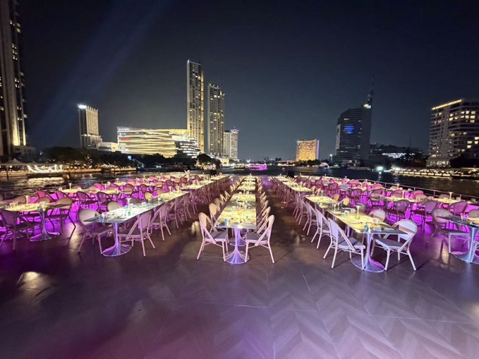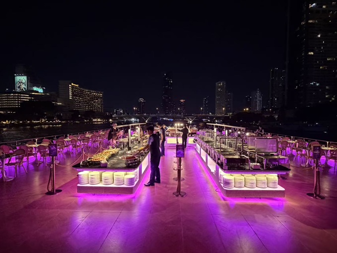 20.15 น. เรือออกจากท่าไอคอนสยาม เชิญท่านอิ่มอร่อยกับอาหารแบบบุฟเฟต์นานาชาติรสเลิศโดยเชฟฝีมือเยี่ยม เคล้าคลอด้วยเสียงเพลงอันไพเราะ จากวงดนตรีบรรเลงขับกล่อมระหว่างรับประทานอาหาร และสนุกสนานเพลิดเพลินกับการแสดง